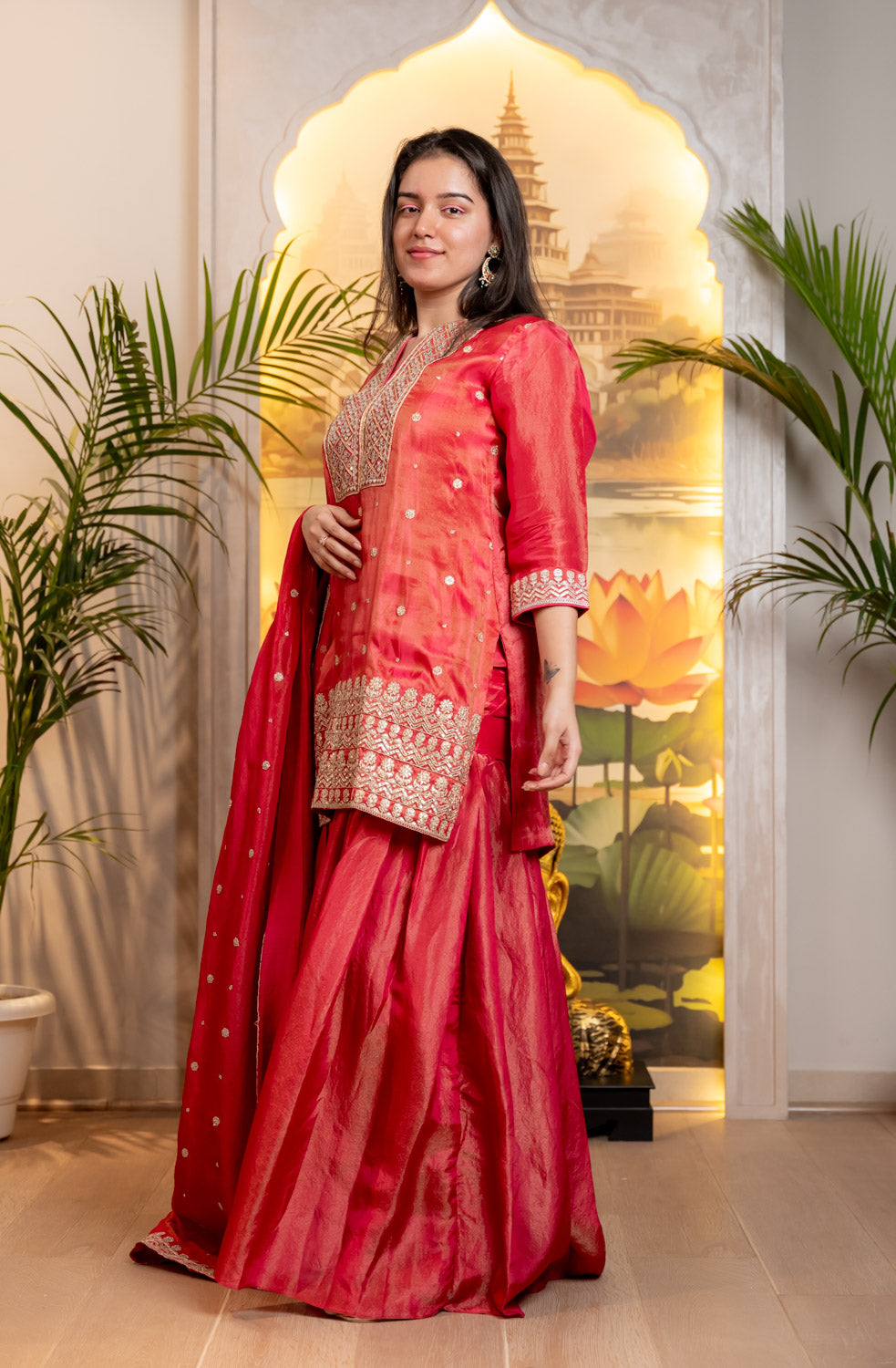 Peach-red blend with a subtle gradient effect. fabric tissue or silk-blend, with a slightly glossy finish.flared sharara, adding volume and elegance and beautiful Peach-red dupatta .
