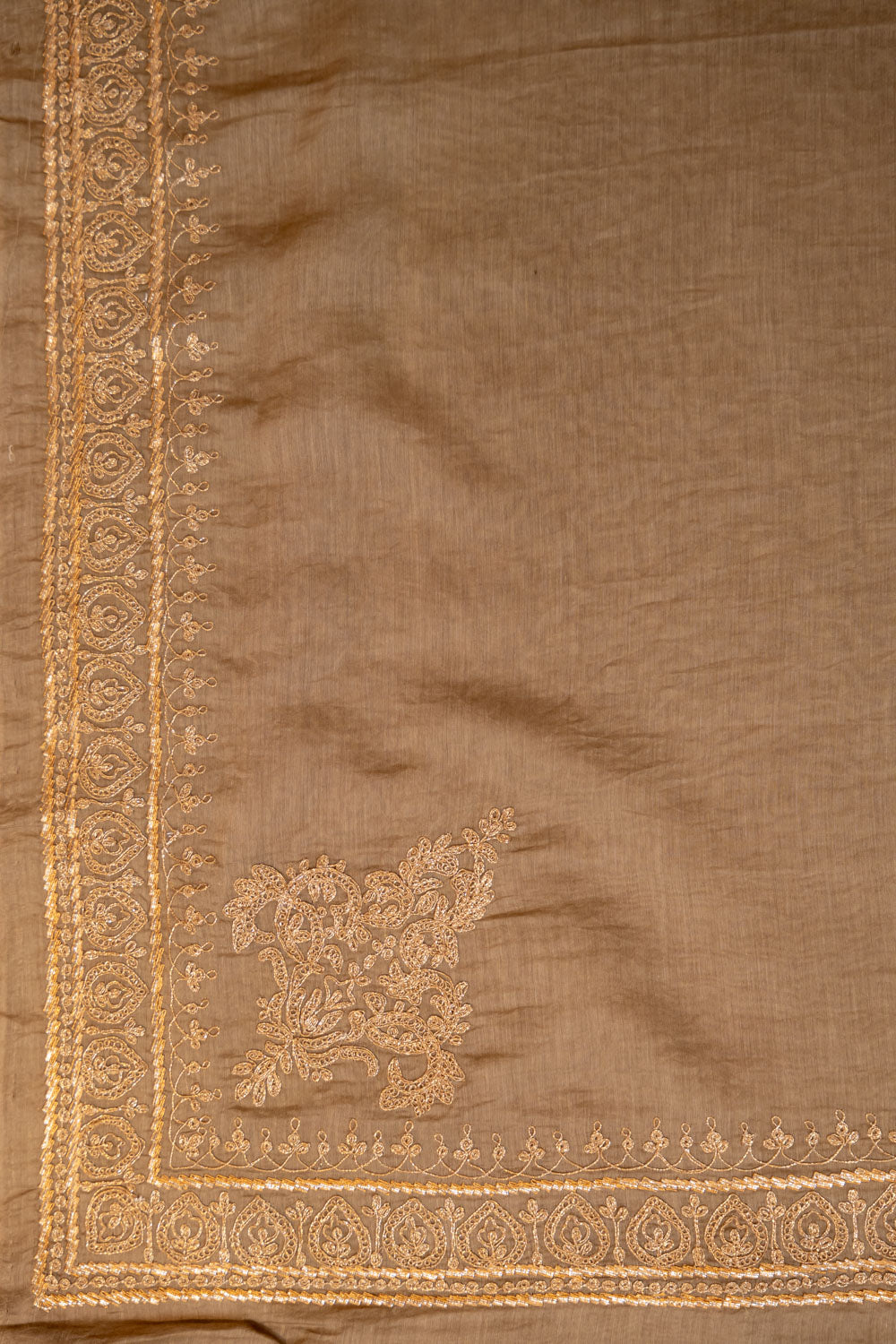 zari embroidery in gold with delicate paisley and floral motifs, accented with hints of pink and powder blue threadwork. The fabric appears lightweight, semi-sheer, and elegant — typical of high-quality Chanderi mulmul, making it ideal for festive or semi-formal wear.