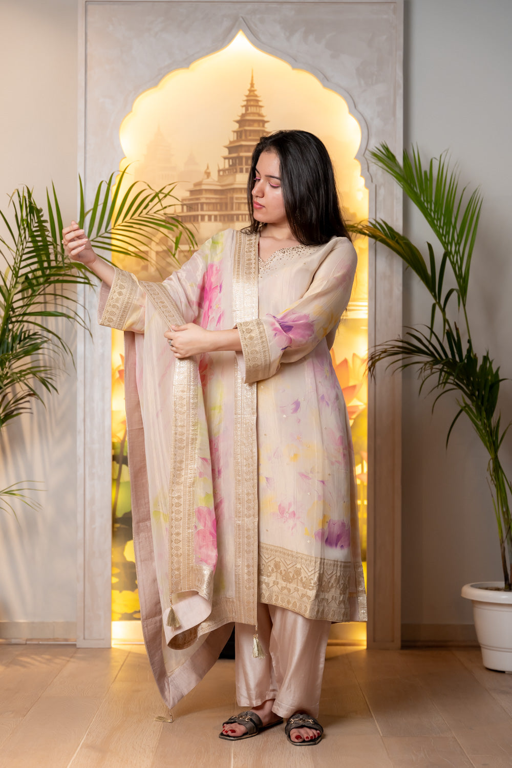 The dupatta is matching in fabric and print, edged with a rich golden zari border, enhancing the elegance pant, also in a soft, satin-like fabric, maintaining the pastel tone to complement the kurta and dupatta.